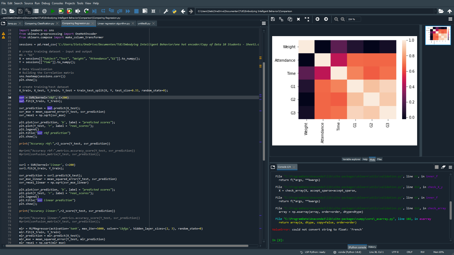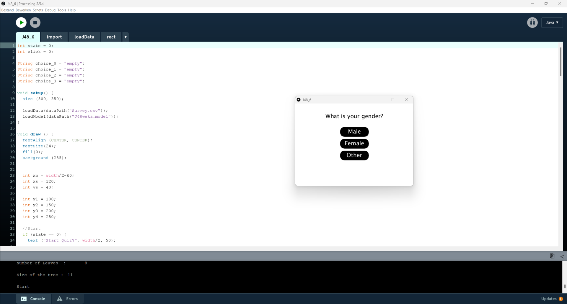 I think this area can be split up into two categories. The analysation of acquired data from participants or other data sets, and the use of coding, algorithms, in products and prototypes. Throughout the study, I have improved in both these aspects. Mainly with data-enabled design, I have learned to analyse data and use this to advance my product, but also during projects like M1.2 and M2.1 I analyse qualitative and quantitative data. The use of data in algorithms comes, back in courses like Embodying intelligent behaviour in a social context, and Designing with and for digital twins: a data-driven Perspective. Here I used datasets to train algorithms and learned to use languages like Python. Furthermore, in the previously mentioned courses, I learned to make predictions using a data set, which is something I further developed within the Designing with Advanced artificial intelligence course. Here I also learned to use Weka and integrate this with interfaces in processing, which touches on Technology & Realization.