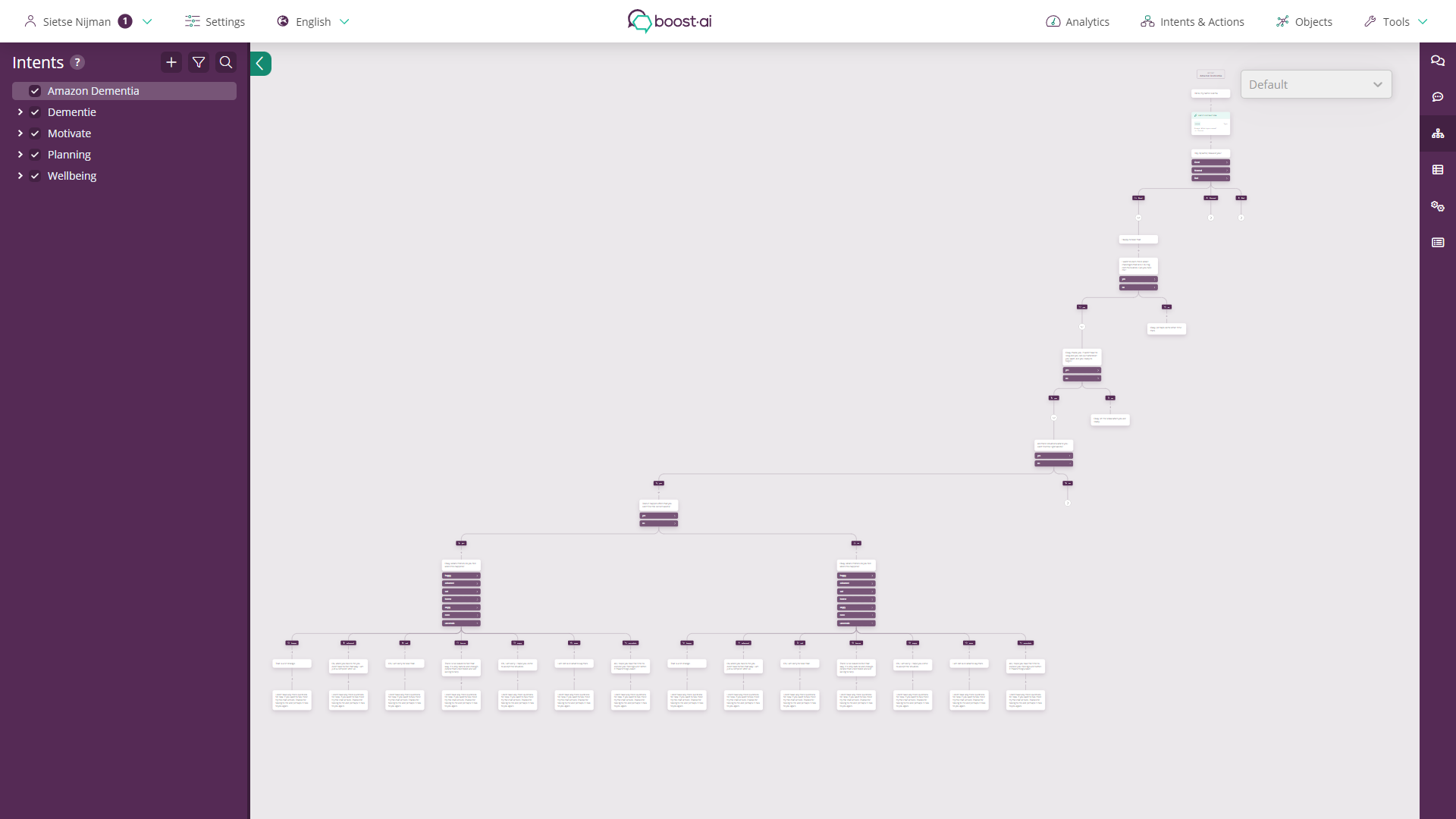During the Final master's program, I further build on already gained skills in the previous two semesters by developing a more complex conversational agent. First of all, I integrated Boost.AI with Amazon Alexa so people with dementia can have a conversation about their symptoms. I also worked more on Machine Learning by making this conversation work properly with the Alexa system but also refined some aspects of ML in the original conversation. I did this by training it on more words, which was also a necessity since I am missing much of the visual aspect that helped limit the possibility of utterances by the user. Afterwards, I moved on from Boost.AI and took a more direct approach in Amazon's developer mode, which required me to learn JavaScript to create randomizers for utterances spoken by Alexa and connect the input of what the user says to the output of Alexa. Unlike Boost.AI Amazon doesn't provide space for a test data set. This is something I did manually so I could improve on the training data. The biggest issue I later ran into with Alexa was that I had a catch-all intent to catch utterances so Alexa could respond with filler words. This often interfered with other intents for which I needed to do a lot of iterations of training data. I started with training other intents on more words, but doing the opposite and training them on fewer words did the trick. Since there is less chance the other intents get picked up.