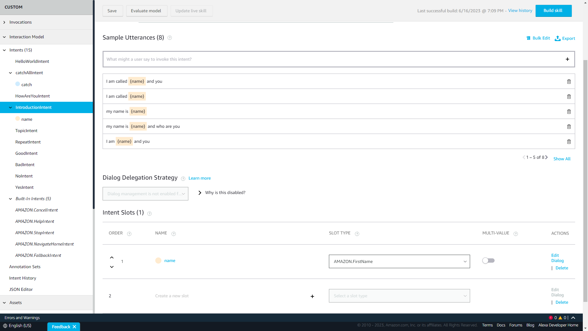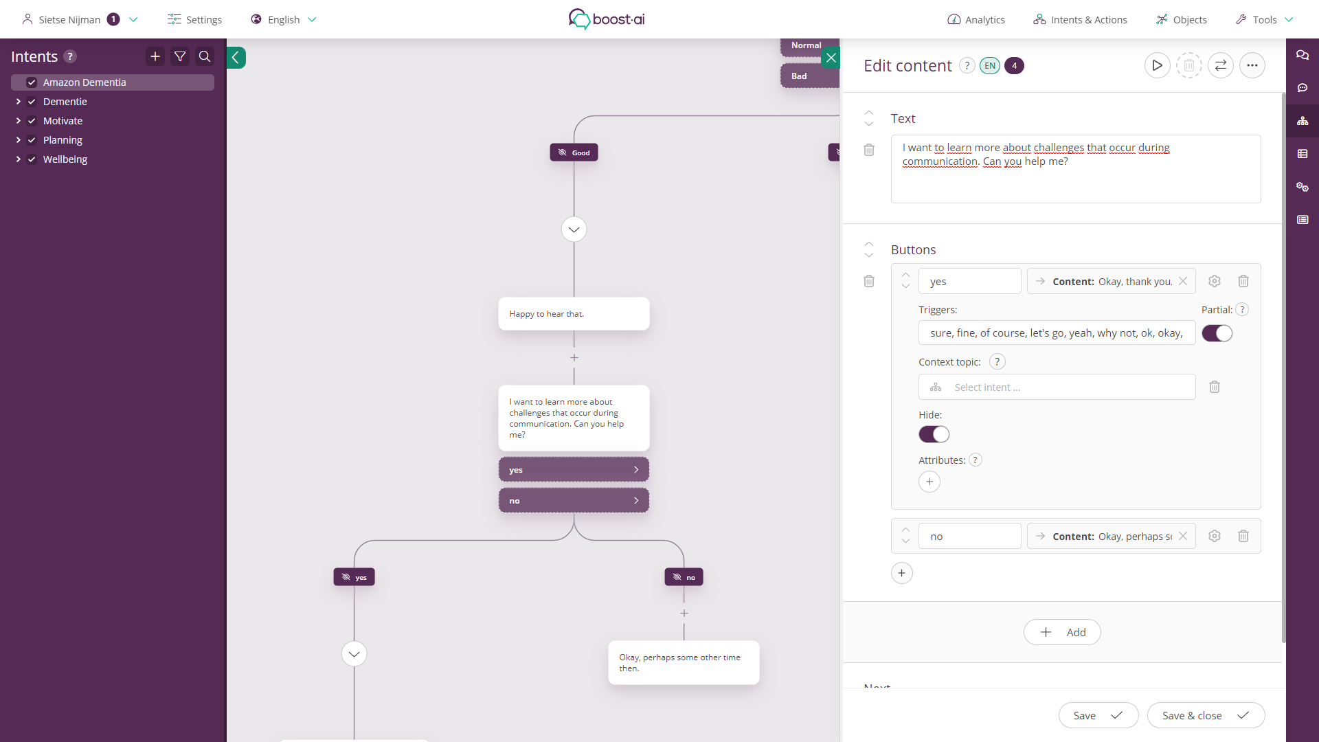 During the Final master's program, I further build on already gained skills in the previous two semesters by developing a more complex conversational agent. First of all, I integrated Boost.AI with Amazon Alexa so people with dementia can have a conversation about their symptoms. I also worked more on Machine Learning by making this conversation work properly with the Alexa system but also refined some aspects of ML in the original conversation. I did this by training it on more words, which was also a necessity since I am missing much of the visual aspect that helped limit the possibility of utterances by the user. Afterwards, I moved on from Boost.AI and took a more direct approach in Amazon's developer mode, which required me to learn JavaScript to create randomizers for utterances spoken by Alexa and connect the input of what the user says to the output of Alexa. Unlike Boost.AI Amazon doesn't provide space for a test data set. This is something I did manually so I could improve on the training data. The biggest issue I later ran into with Alexa was that I had a catch-all intent to catch utterances so Alexa could respond with filler words. This often interfered with other intents for which I needed to do a lot of iterations of training data. I started with training other intents on more words, but doing the opposite and training them on fewer words did the trick. Since there is less chance the other intents get picked up.