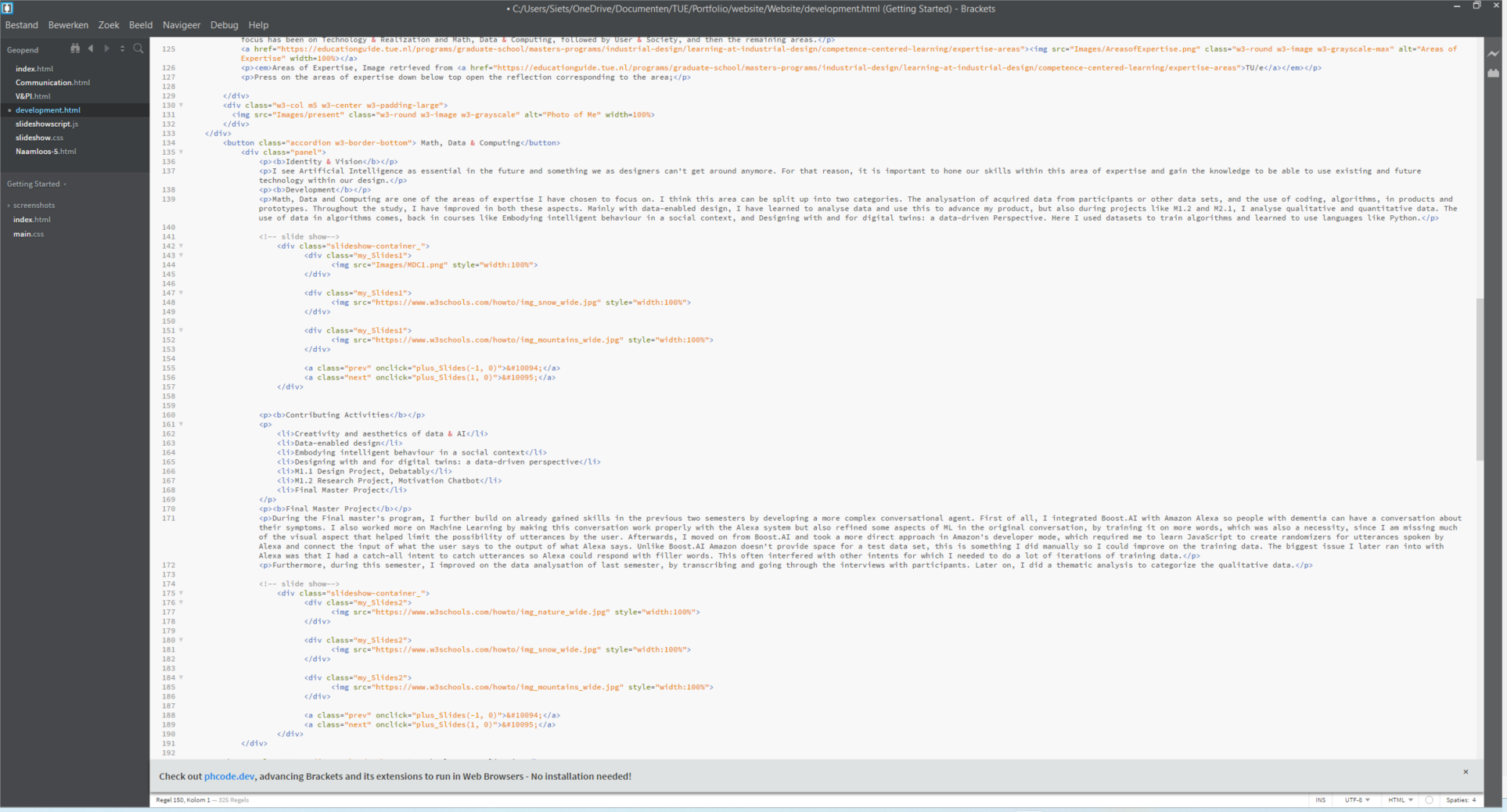 Throughout my master's I have developed in this area through multiple courses and activities. With the data-enabled design course, I focussed on electronics, 3D printing and the integration with OOCSI and Data Foundry, which is similar to what I did for the digital twin's course and overlaps with Math, Data & Computing. In other courses, I focussed more on the digital space like embodying intelligent behaviour, designing with advanced artificial intelligence, and my last three projects. Here I learned to work with Arduino and processing, but also more advanced languages like Python, JavaScript and HTML/CSS. The latter I have used to make this portfolio from scratch. I learned how to create conversational agents like voice agents and chatbots, but also interfaces.